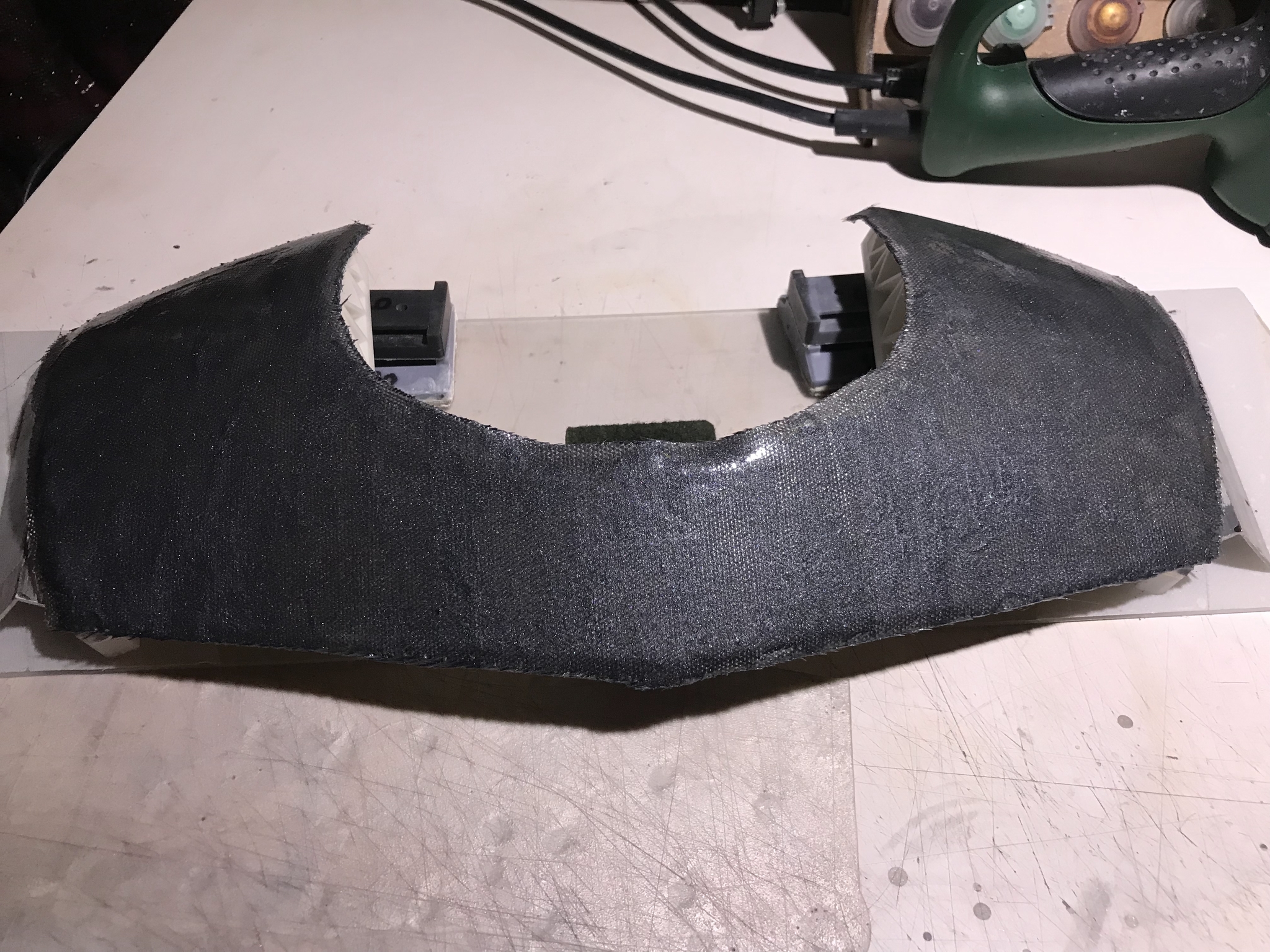 единственное отличие с наплечником - под "бутерброд" из верхнего слоя смолы и стеклоткани я выложил стропу 25мм и примерно через часов 5 после заливки я также обрезал контур и изогнул его, зафиксировав изгиб на куске толстого оргстекла с помощью алюминиевых уголков на двусторонний тканевой скотч и таким образом оставил застывать дальше. по итогу получаем такую вот заготовку