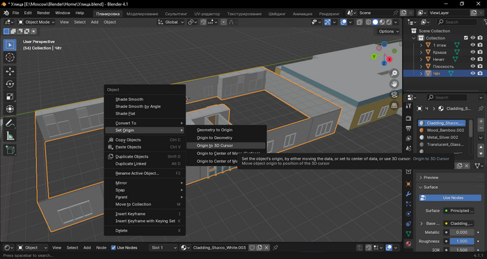 Необходимо это делать по нижней части модели, т.к. Blender будет на неё ориентировать при процедурном построении этажей. Чтобы 3D Cursor встал на начало координат, т.к. на нём будут создаваться модели, необходимо нажать Shift+C.