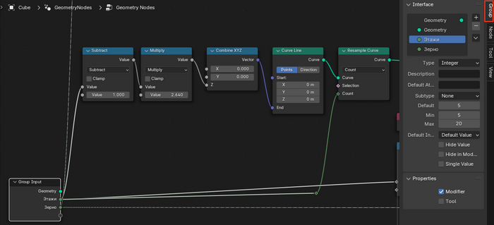 После создаём Combine XYZ, соединяем с Z, далее Curve Line, соединяем с End, после Resample Curve, из предыдущего Нода соединяем ячейки Curve, из Group Input значения с этажами и Count.