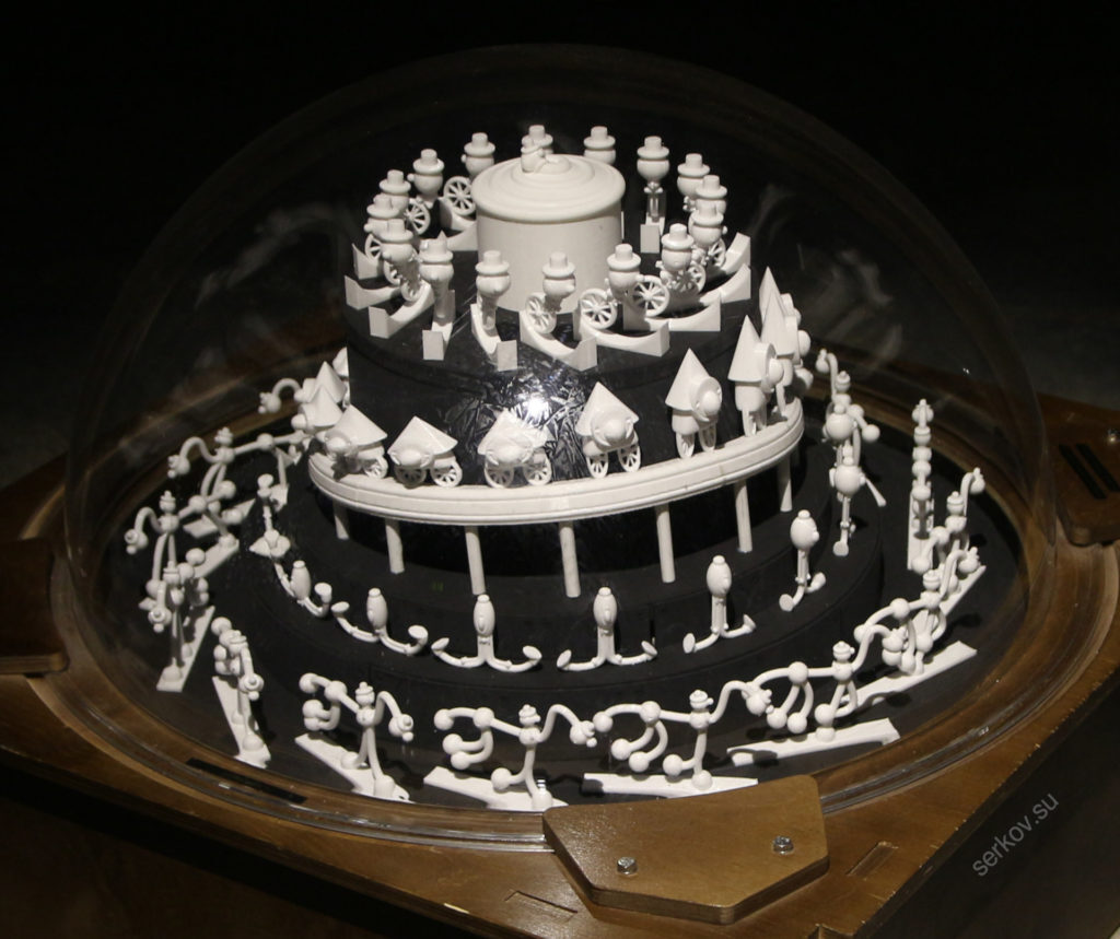 Обратились ко мне ребята со студии «Светлые истории». Они организовывали выставку анимации «Случайная последовательность», и в поисках интересных идей приехали в гости к нам в мастерскую. Пообщавшись, решили скооперироваться и сделать трехмерный зоотроп. Мы такие делали, но гораздо большего размера, и с анимацией из вручную расставленных фигурок, купленных в магазине игрушек. Замысел был такой — я делаю техническую часть, сообщаю размеры внутреннего пространства, а дальше художник рисует анимированные фигурки, творчески ничем не ограниченный.