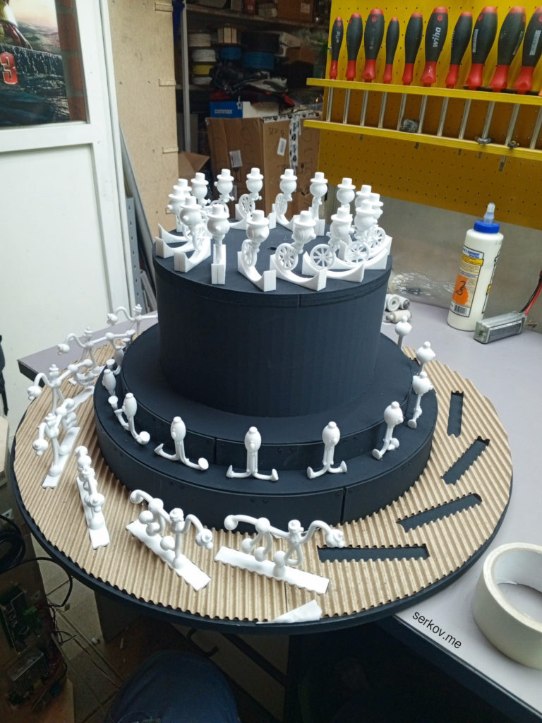 Дальше сборка, аккуратно приклеиваем все. Белые фигурки на черном фоне смотрятся вполне симпатично, так что экономим время на покраске. К сожалению к открытию выставки я не успел, инсталляция появилась на второй день после открытия и непрерывно проработала до января.