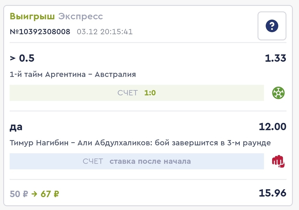 Сегодня сделал немного ставок, одиночные и экспрессы. По факту остался в небольшом минусе, но это не страшно, учитывая мои "баснословные" вложения. Сижу, значит, время 20:00-20:15. Скоро прекрасный футбольный матч Аргентина - Австралия. Поставил галочку на то, что в первом тайме забьют хотя бы один гол, угадал. И думаю, маленький коэффициент, толку не особо много, поставлю ещё на какой-нибудь бой. В разделе прематч попадается мне бой Нагибина - Абдулхаликова. Сделал ставочку, что бой продлится 3 раунда. Тут уже коэффициент значительно вырос с 1.33 до 15.96. Закинул на экспресс 50 рублей. И ушел заниматься делами. Спустя несколько часов возвращаюсь, лицезреть результаты. А там..