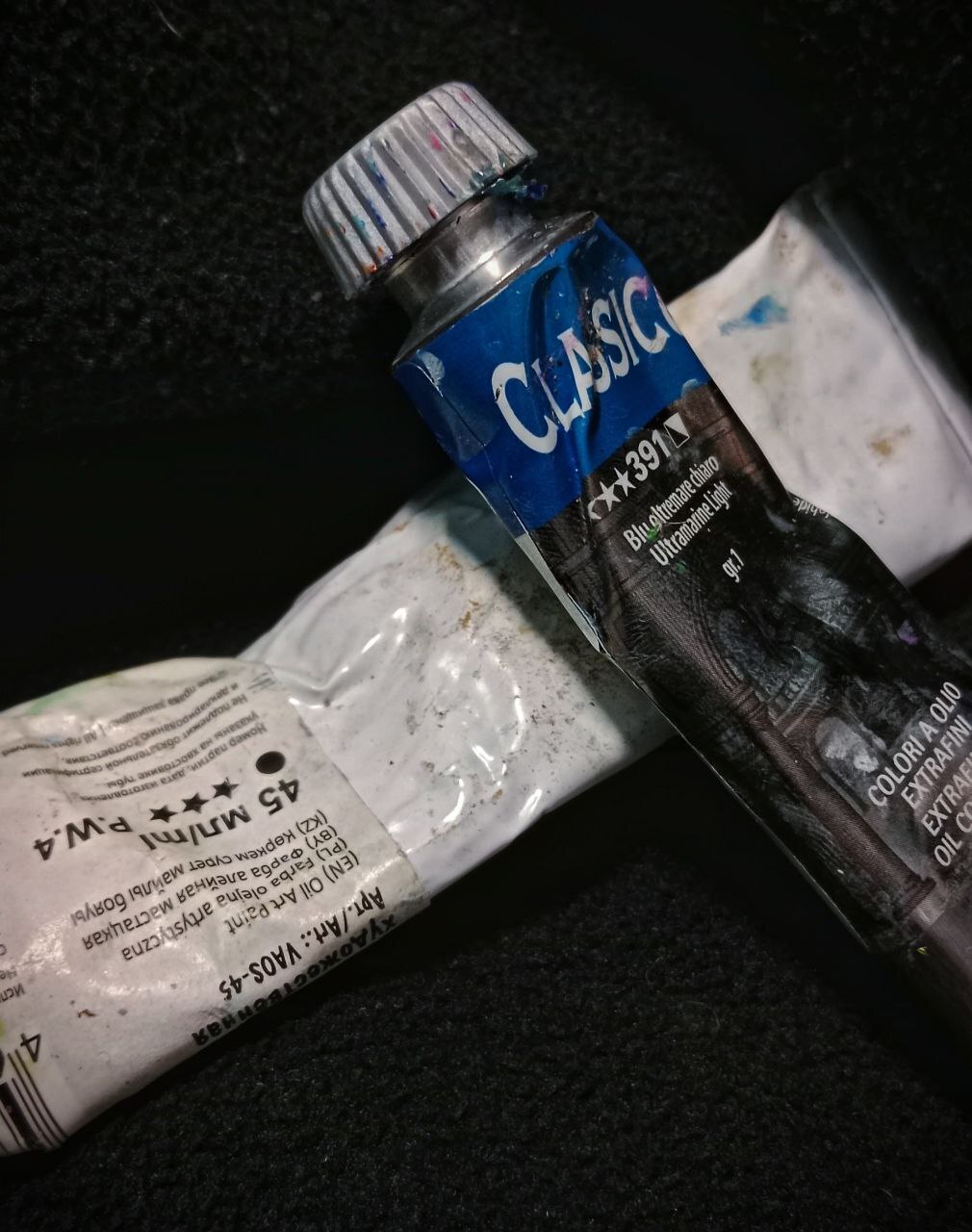 Тут смотрим, валяются какие-то тюбики на земле. С синей краской)
