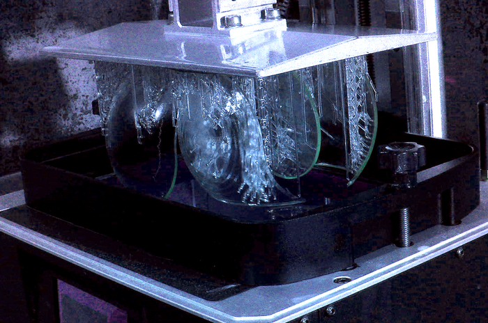 Пытался сэкономить -разместил деталь в детали, как итог - одна опора пробила фонарь над сиденьем. Хотя какая разница? Всё равно модель отклеилась из-за слабой экспозиции первых слоёв — новый пластик подвёл. Пришлось экстренно останавливать печать.