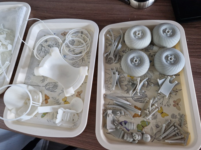 В итоге получился вот такой набор. Часть деталей печатал водорастворимой смолой, часть — обычной. Первая мне нравится больше: хоть и дороже, но опыт использования в разы приятнее. Да и домашние перестали спрашивать: «Ты опять свою шарманку завёл?». А ещё водную смолу проще утилизировать.
