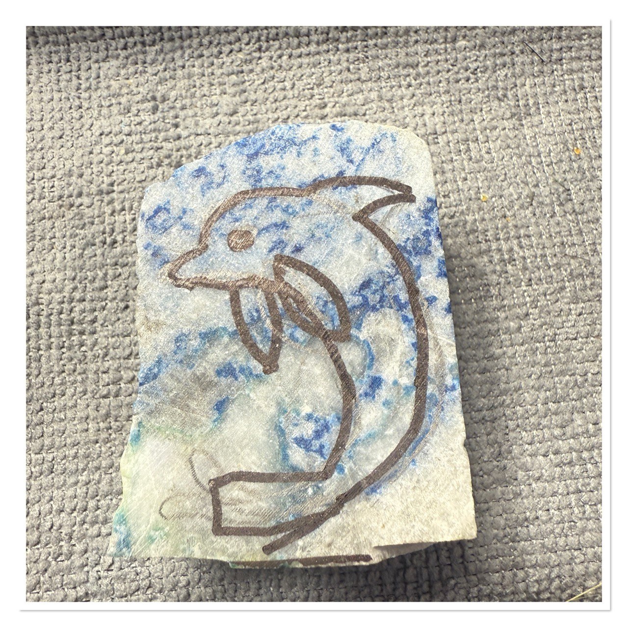 Кусок лазурита купила давно, но все никак не придумывалось, что же из него вырезать. И вдруг совпало - приятельнице нужен оригинальный подарок для любителя морских обитателей в целом и дельфинов в частности и ей очень приглянулся именно этот камень.