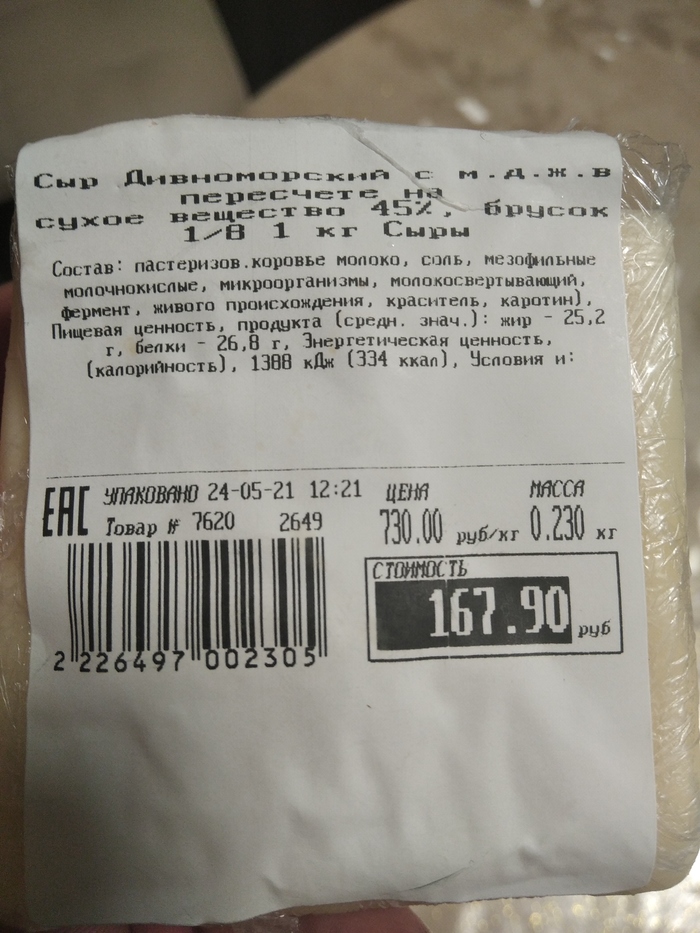 Сегодня супруга купила сыр в притягивающем металл магазине:) В названии сыра написано Дивноморский, так как я из Краснодарского края и Дивноморск это село Геленджикского района где на тысячу дельфинов приходится половина коровы, один вопрос, откуда молоко???