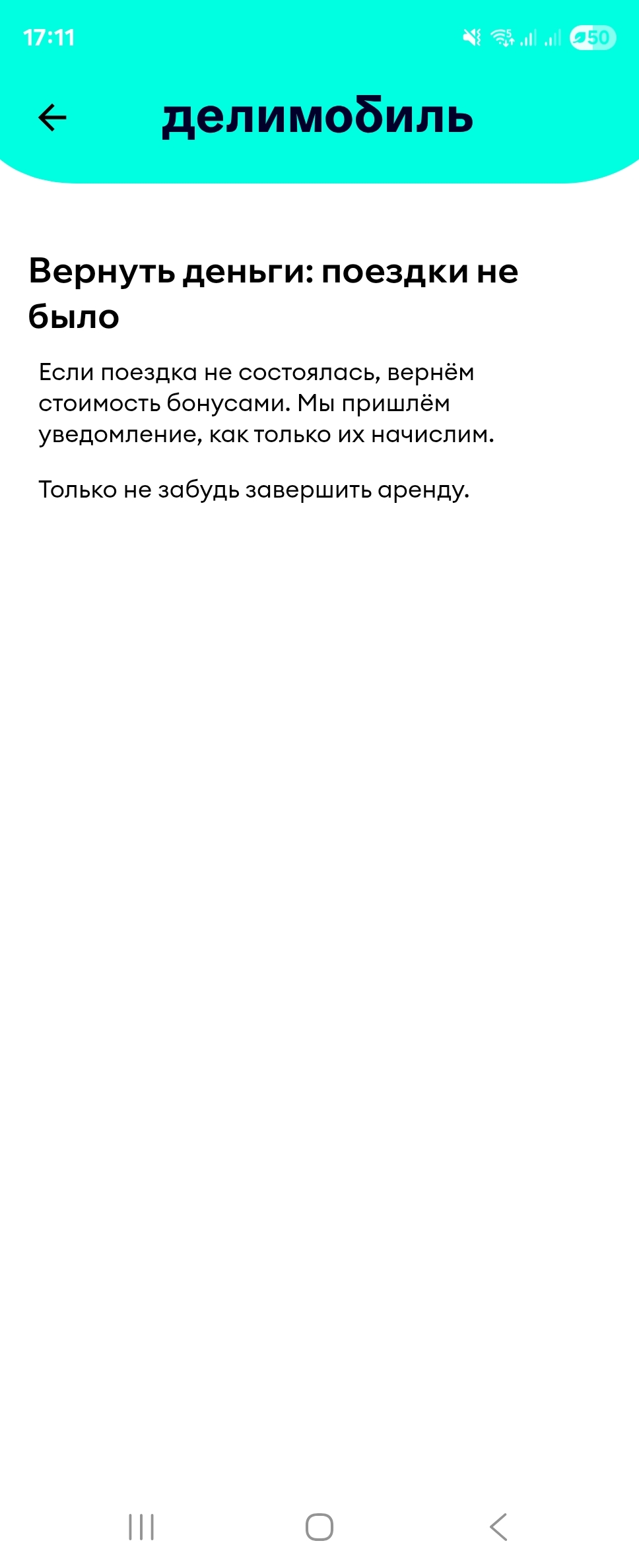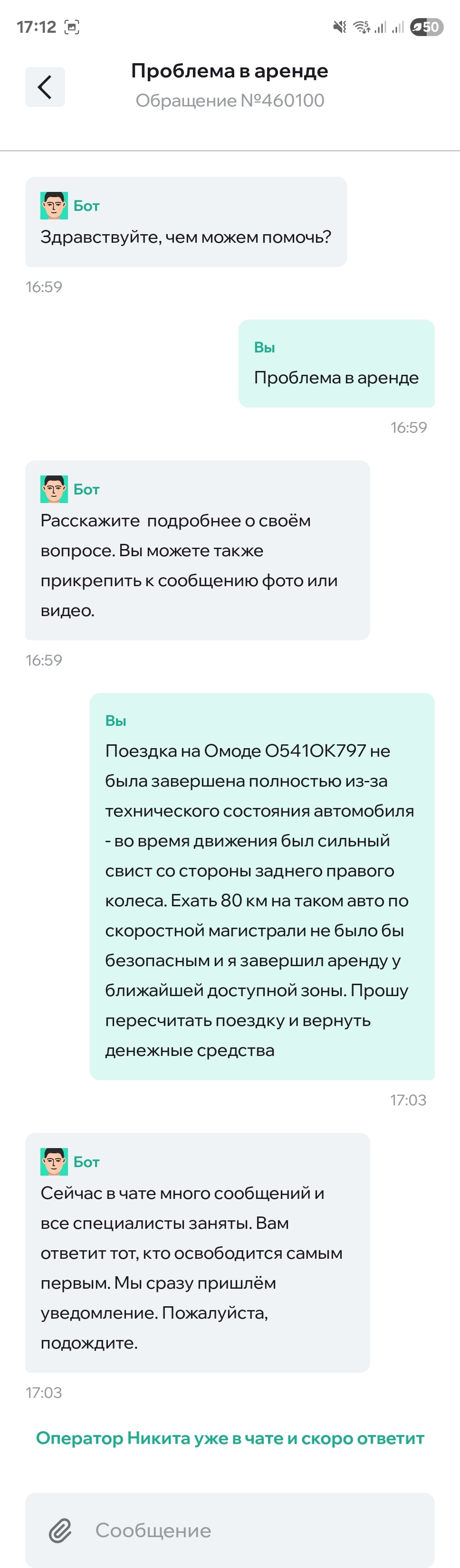 Кратко: взял карш в Ленобласти по тарифу "Фикс" (около 90км), в дороге появился громкий скрежущий звук в районе задних колёс. Завершил аренду в ближайшей доступной зоне через 10км и не смог дозвониться до оператора - время ожидания 20 минут. Сделал всё по инструкции от сервиса. Добирался альтернативно, по приезду написал обращение о перерасчёте поездки, в ответ - "мы не обязаны возвращать, вы ж ездили".