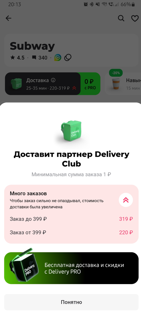 А там дамы и господа, притаился обман. Сейчас якобы имеется "высокий спрос", который в городах миллионниках висит практически в любое время дня и ночи у всех нормальных и популярных ресторанах, при этом зайди в ресторан лично вы можете увидеть штук 5 курьеров, которые лениво смотрят смешные картинки в интернете и не торопятся куда-то доставлять что-то. Останетесь на полчаса в таком ресторане скорее всего картина не поменяется и за полчаса никто никуда не уйдет ничего доставлять. И вот уже никто не спешит предоставить вам обещанную бесплатную доставку. По факту она может быть ниже, чем указанная на скриншоте, например при попытке сделать заказ до 399 в Subway у меня высвечивалась доставка в 219 рублей, а при попытке сделать заказа больше 399 стоимость снижалась до 120 рублей, что ниже, чем представленные на скриншоте значения, но это не отменяет ложной рекламы. В отдельных местах доставка запросто превышает стоимость какого-либо комбо набора, а вы ведь помните, что там еще сверху накидывается сервисный сбор?