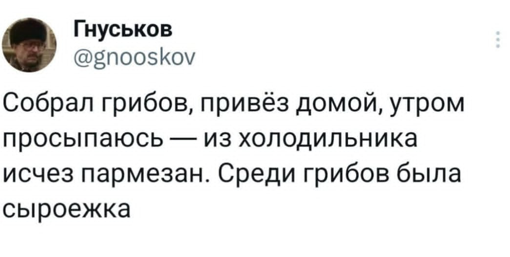 6307 supasheff Дело было в Рязани, грибы были с... 1 месяц назад Юмор X (Twitter) Грибы Сыр Игра слов Скриншот Сыроежка 681 35 14 7 4 3 1 1 Ещё 3
