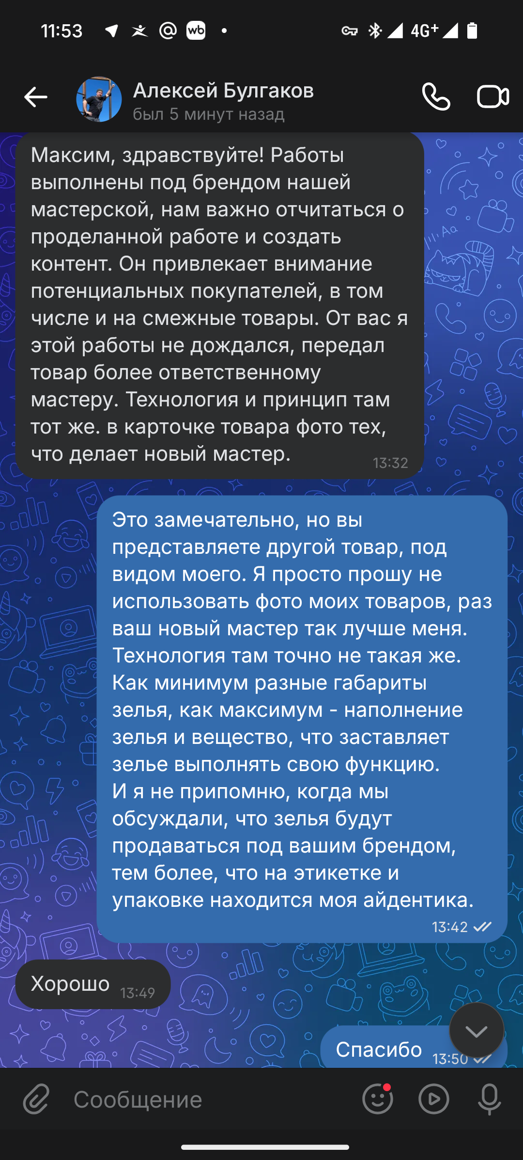 Мне такое естественно не понравилось, так как зелья мои, красота моя, а пользуются ей почему-то другие. На тот момент я решил все разрулить тихо, и просто написал Алексею, что вот мол, уберите и не будет ругаться. Этот шедевральный диалог можете прочесть тут.