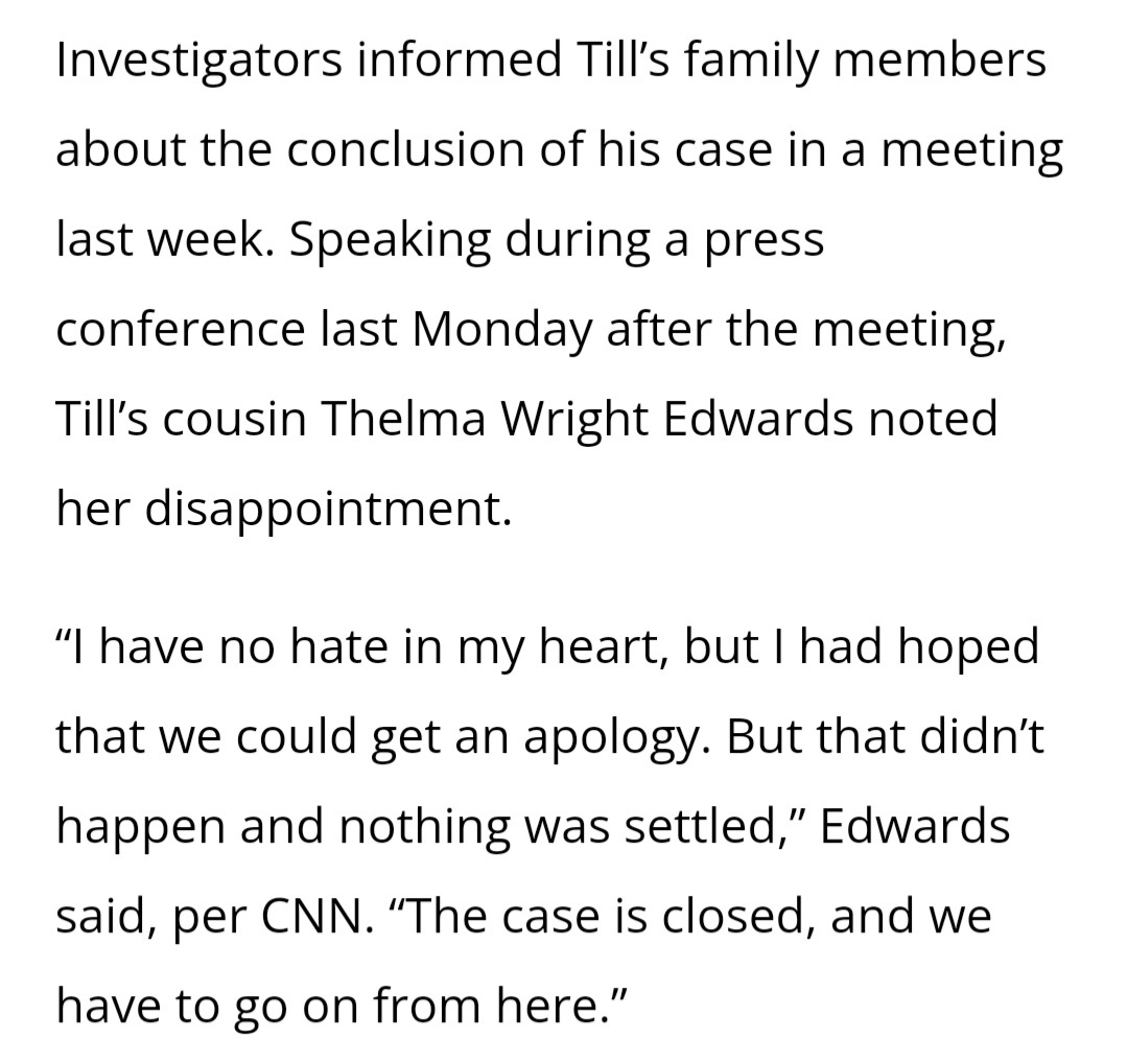 Интересно что следователи лично пришли к родственникам убитого Эммета объявлять о закрытии дела, и там от них "ожидали извинений за это", однако следователи не стали извинятся: