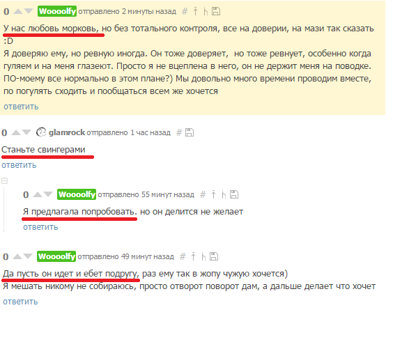 Я не отказываюсь от секса, сделать минет или еще что похлеще не проблема, единственное что не даю в попу, больно да и страшно, но это только пока что. И мне просто до жути обидно из-за его этой дебильной шутки. Но и в пятый раз все бы спустила на тормозах, если бы не его одна "подруга". Они когда-то переписывались, общались еще до меня и она бросала ему свои фотки в белье и все в таком духе. Они вместе ходят в рейды (ну мне-то на это глубоко ложить, если бы не одно но). Он то ли специально, то ли в шутку, то ли хуйегознает зачем, в рк говорил с ней часто. сидел ржал и тд и тп, были заигрывания.