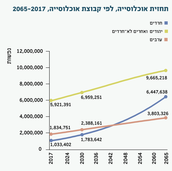 Состав населения: синие - ультраортодоксы, красные - арабы, охристые - все остальные.