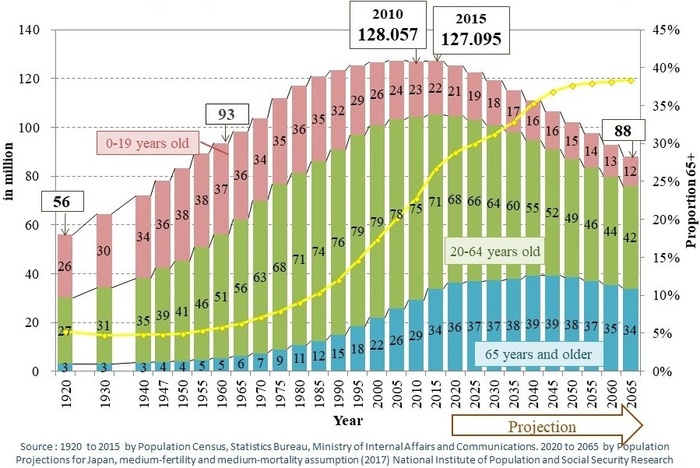 Население Японии по возрастам и доля лиц в возрасте старше 65 лет (жёлтая кривая) [29]