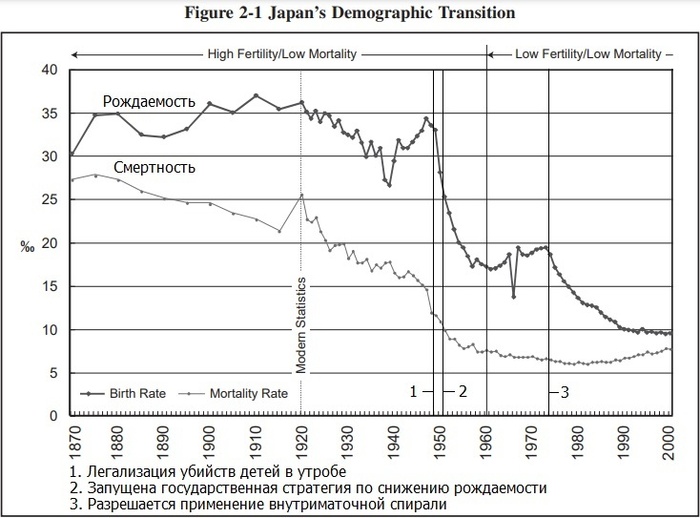 «Суммарный коэффициент рождаемости в Японии снизился с 4,3 в 1949 году до 2 в 1957 году… Снижение рождаемости было обусловлено доступностью различных средств контроля рождаемости и легализацией абортов», – признаёт историк Ю Лин Хуанг [31].