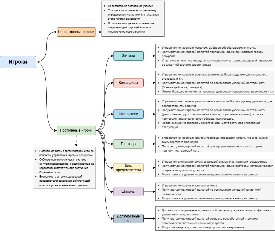 Кто-то готов участвовать ежедневно и вникать во все аспекты. Но далеко не все такие. Зачем ограничиваться. Теперь в игре будет четкое разделение на постоянных и непостоянных игроков. Для обоих типов участников есть свои правила, возможности и влияние. Вникать в полный свод правил не требуется.Каждый постоянный игрок будет иметь конкретную роль в вопросе управления цивилизации. Игроки вполне могут не подчиняться власти в государстве ради своей выгоды. А также будут конкурировать друг с другом. Из-за этого политический курс государства может быть продиктован не развитием государства, а лоббированием интересов конкретных игроков.