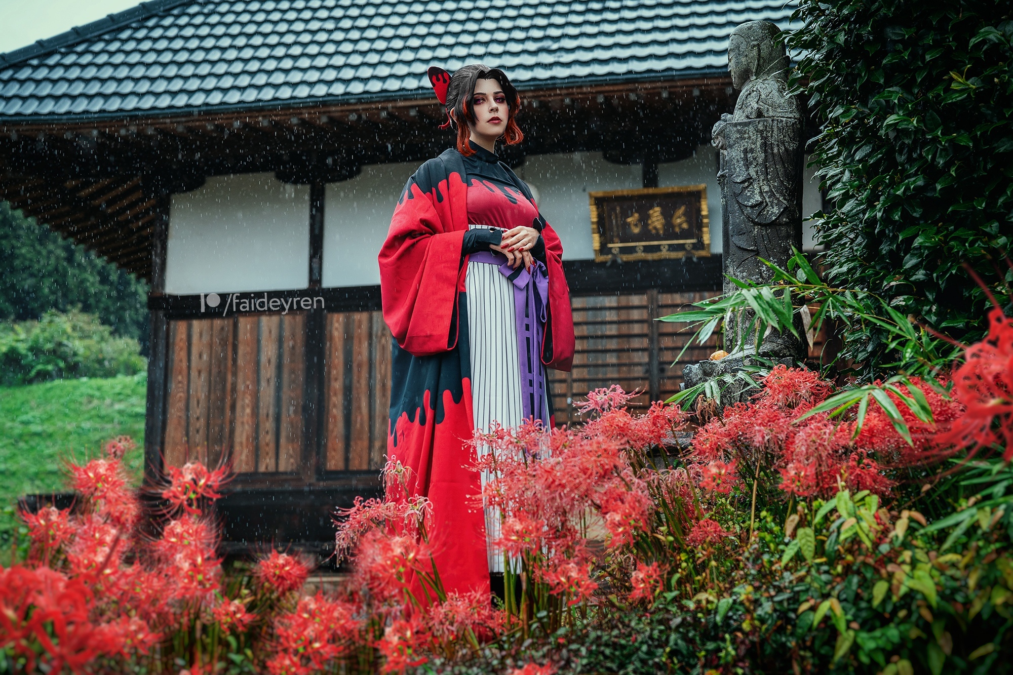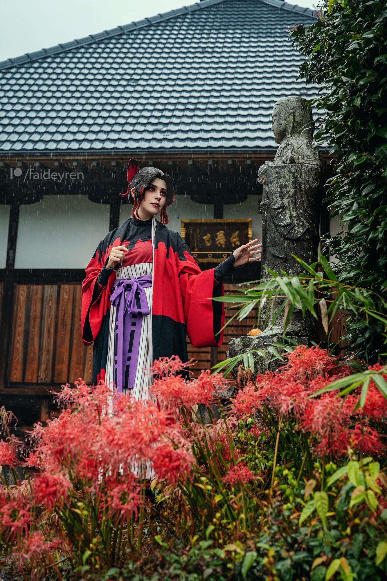 К сожалению в это время на наш регион шел тайфун и дождь лил не переставая все дни, но нам важно было успеть на цветение пока ветер не уничтожил цветы. По иронии судьбы до знаменитого поля ликорисов мы не добежали, тк ливень был стеной. Поэтому прибились к ближайшему храму и фотографировались возле него, выбегая из-под крыши на минутку, чтобы сделать пару кадров и убежать назад. А говорят, что демонов страшит солнечный свет... Могу заверить, что в дожде с ветром приятного тоже мало) Так что капли дождя на фото настоящие!) Промокли до нитки, но я думаю, что такая погода лишь добавила атмосферности!