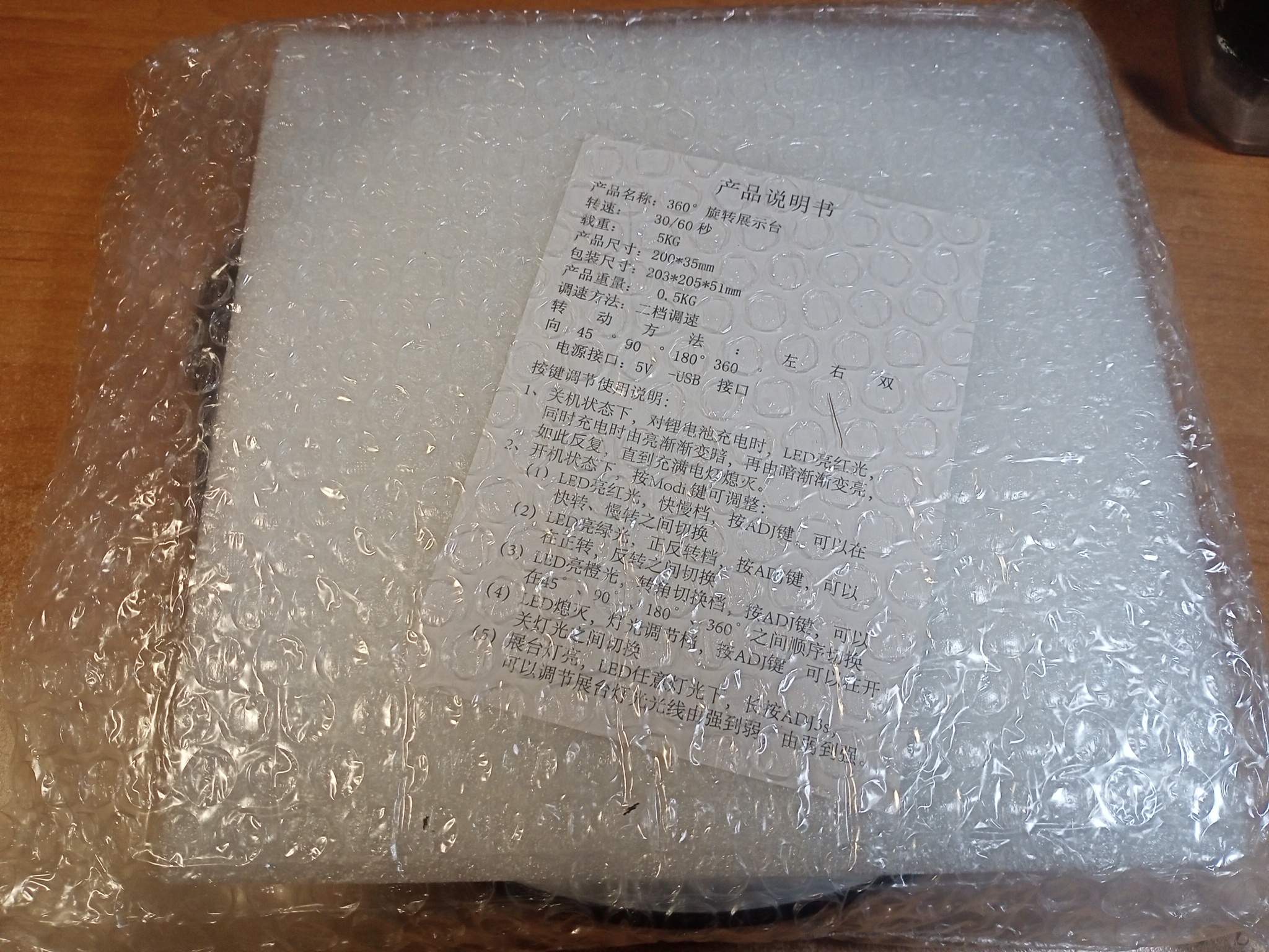 Внутри коробочки сама подставка и USB-шнур, упакованные в пузырчатую плёнку, с одной стороны проложен пористый материал для повышения сохранности. На зеркале наклеена защитная плёнка, которую я не стал снимать для обзора, так что не обращайте внимания на царапины и мутность стекла. Внутри пакета - инструкция на непонятном языке, на самой коробке - на международном английском с несколькими китайскими очепятками. Инструкция касается зарядки и настройки режимов вращения.