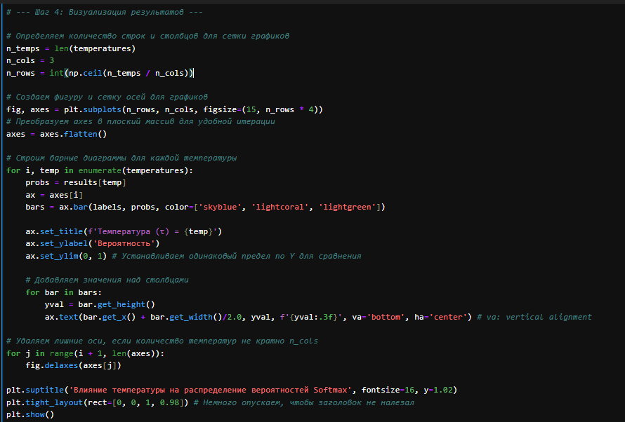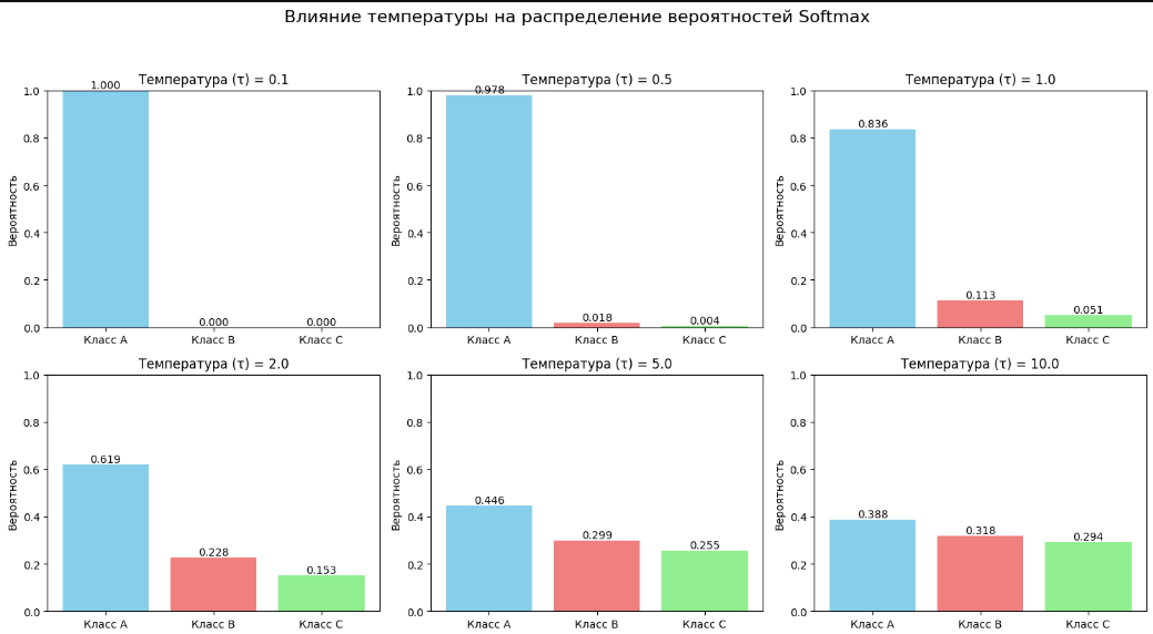 Пример наглядно показывает, как параметр температуры τ позволяет контролировать "уверенность" или "случайность" выбора в функции softmax.