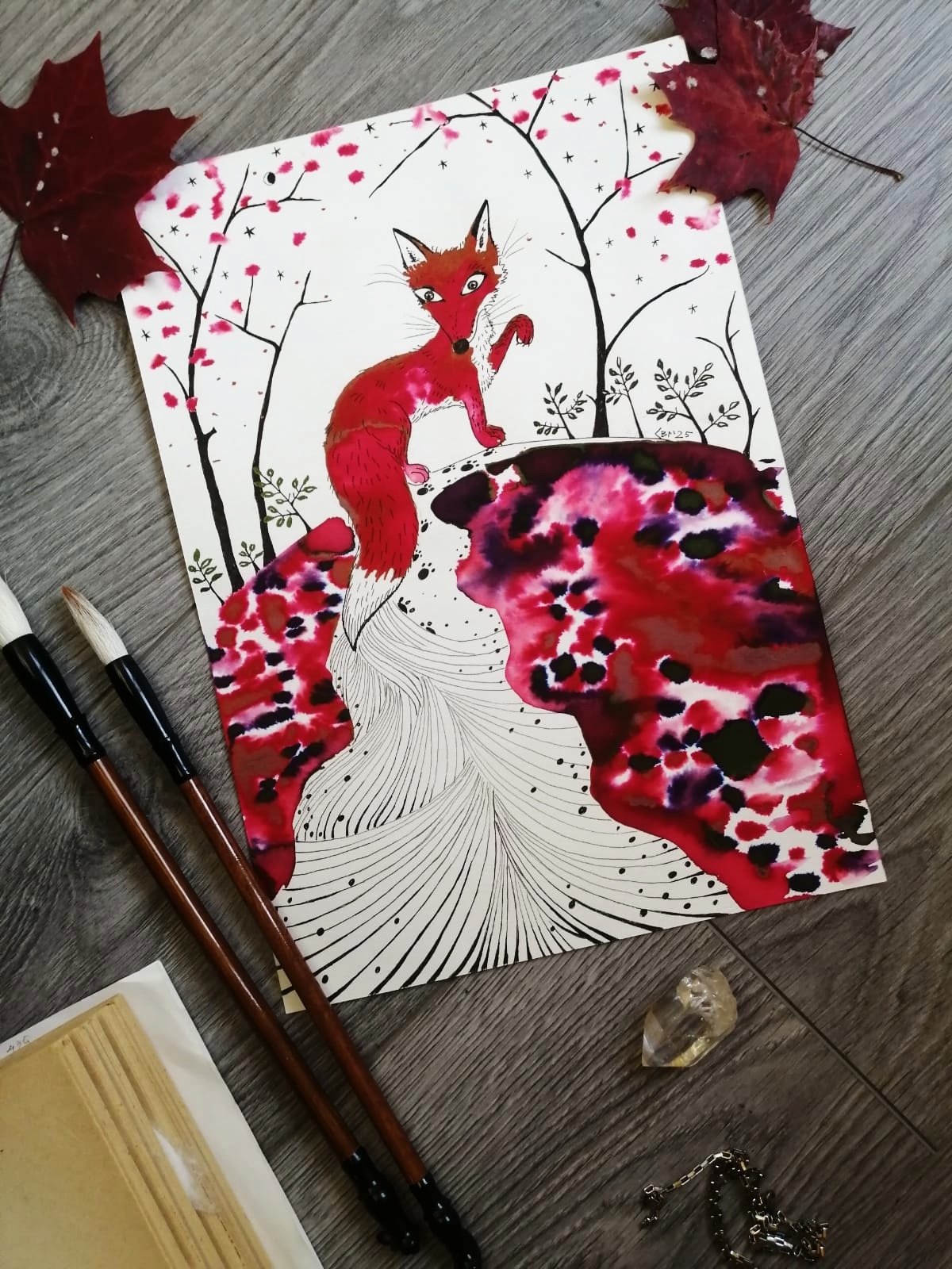 Чернила распадающиеся с блеском, линер, бумага. А4.