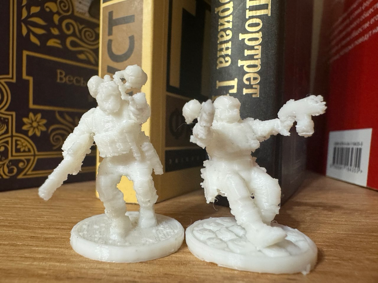 Суть моего текста, я бы очень хотел понять насколько я далек от оптимальных настроек печати для миниатюр размером 28мм, у меня есть пример двух почти идентичных фигурок, где:
