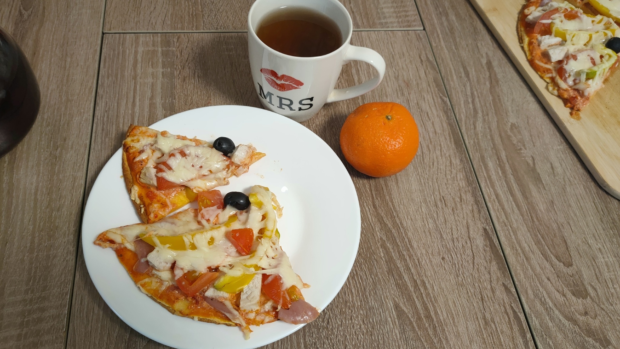 Завтрак: наивкуснейшая пицца, чай ииииии мандарин! (я ем и другие фрукты помимо помело)))
