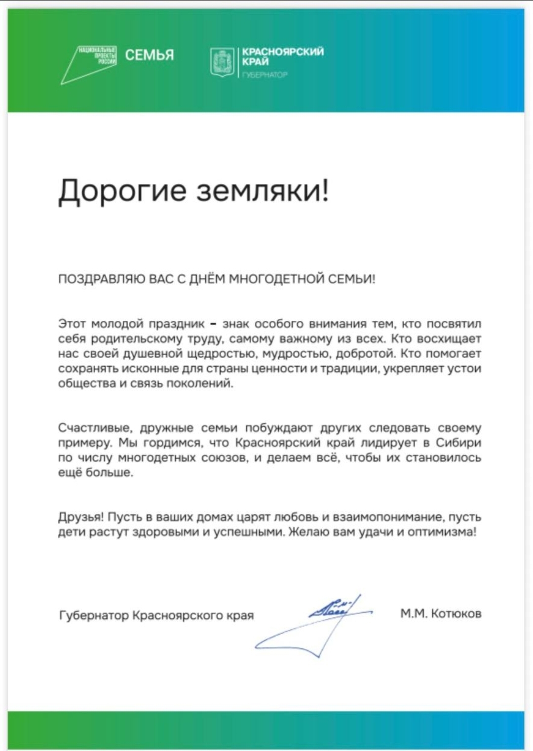 Поздравили с днём многодетной семьи. Жене скинули на госуслуги целую картинку. А мужу не скинули. И фамилии не подписали даже кого поздравили. Мы очень ценим такое поздравление! Жить теперь нам станет намного легче и проще. Спасибо уважаемые вы наши. Нам так этого не хватало)))