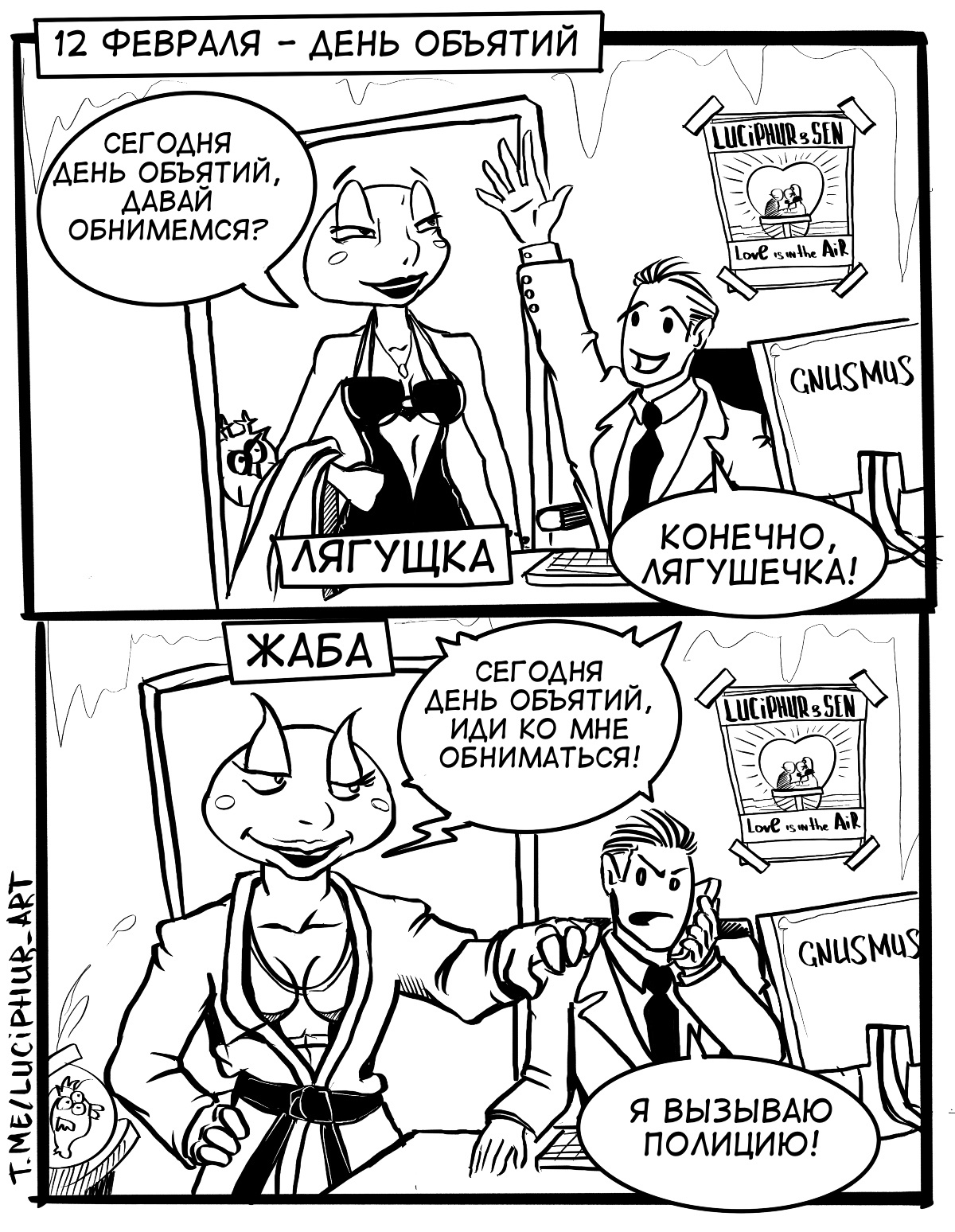 Мне, конечно, сразу вспомнился известный комикс про «допустимый флирт» и «харассмент». Все такие праздники с обнимашками, которые я наблюдал лет с 14, заканчивались примерно так же. Грех было не использовать этот сюжет на средовой лягушке.