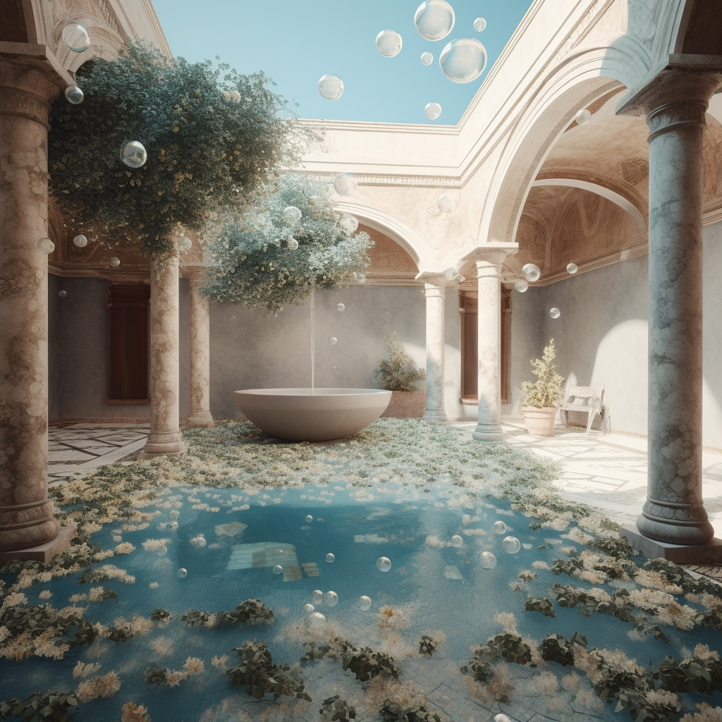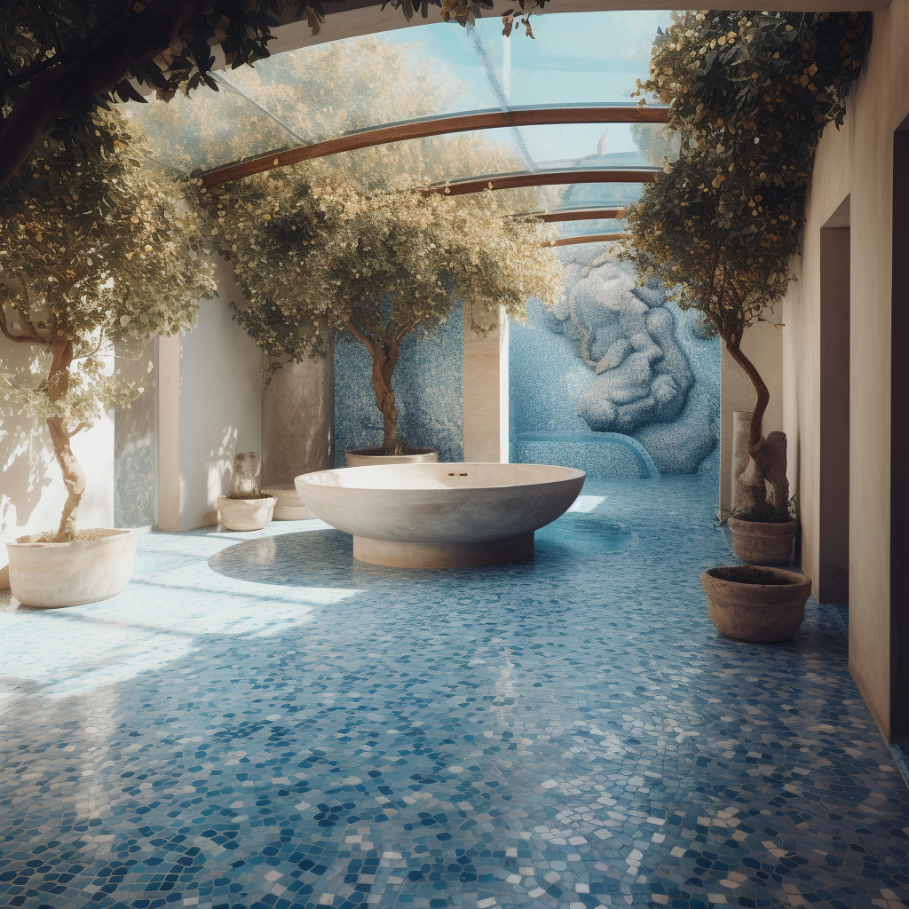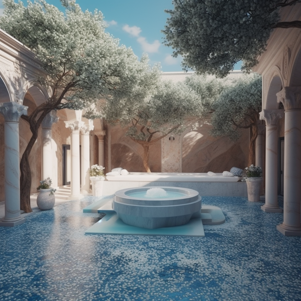 an outdoor modern baths in ancient Rome style with olive trees dreamy cloudscapes, flowing paper sculptures, delicate forms. thousands of blue lagoon petals on ceilings, mosaic floors, elegant fresh airy colors Architectural Digest Style shot with Canon R5