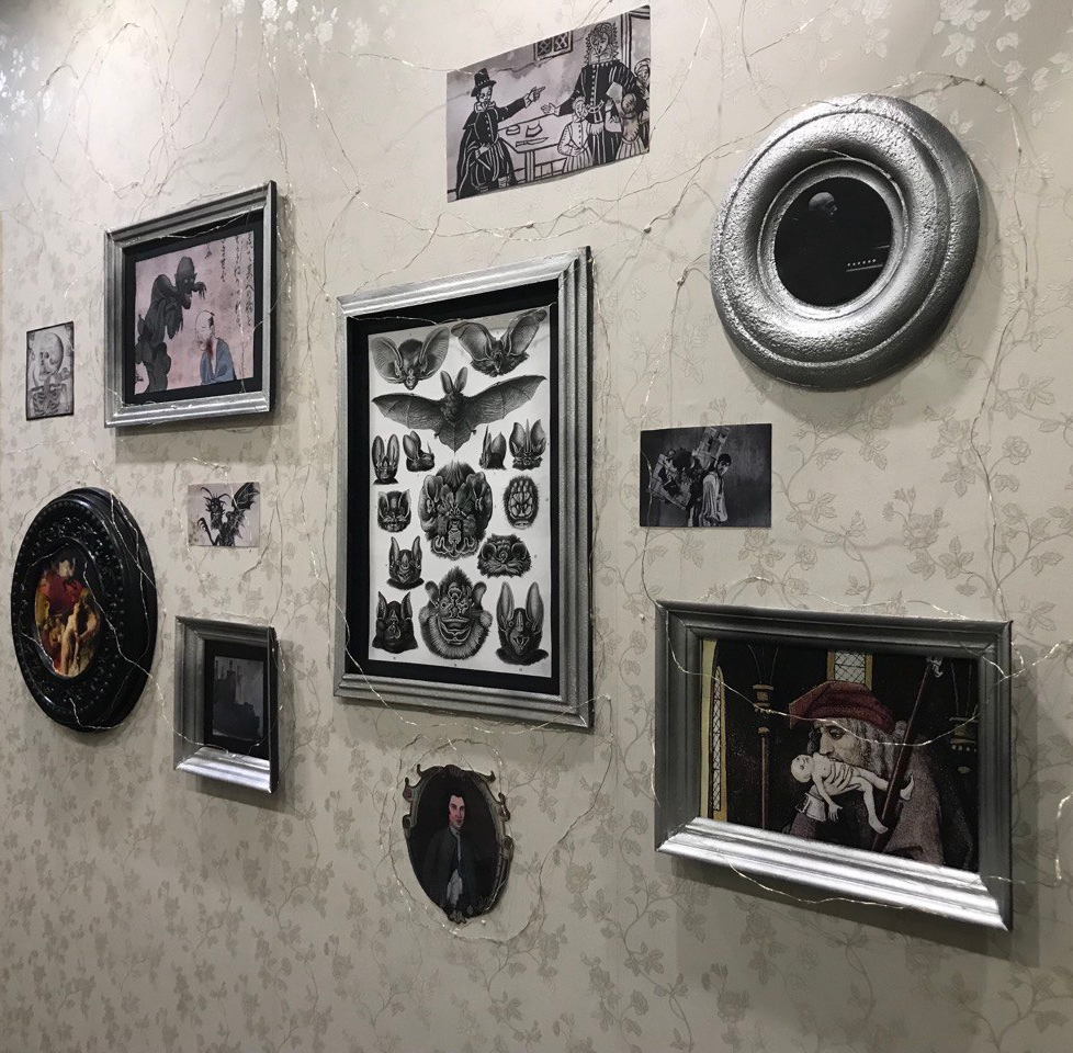 рамки для картин сделала из потолочных плинтусов и пенопластовых розеток, сами картины просто поскринила из фильма и распечатала