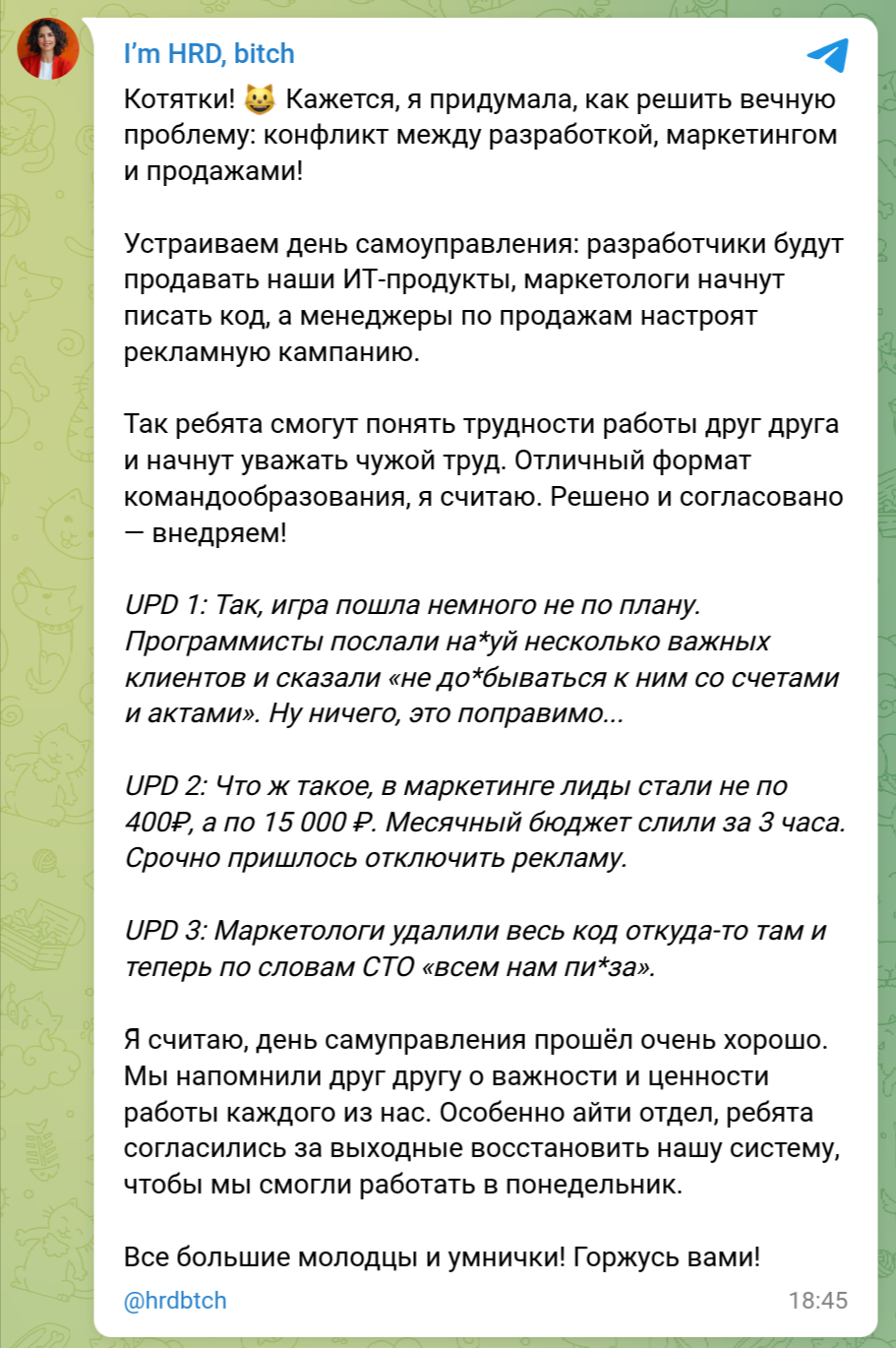 29 imctobitch Норм автор День самоуправления в IT-компании Серия I'm HRD, bitch 1 год назад ❤️ Телеграм-канал [моё] Юмор IT юмор Разработка Скриншот Работа HR Самоуправление Маркетинг Мат Офисные истории 3 2 Ещё 0