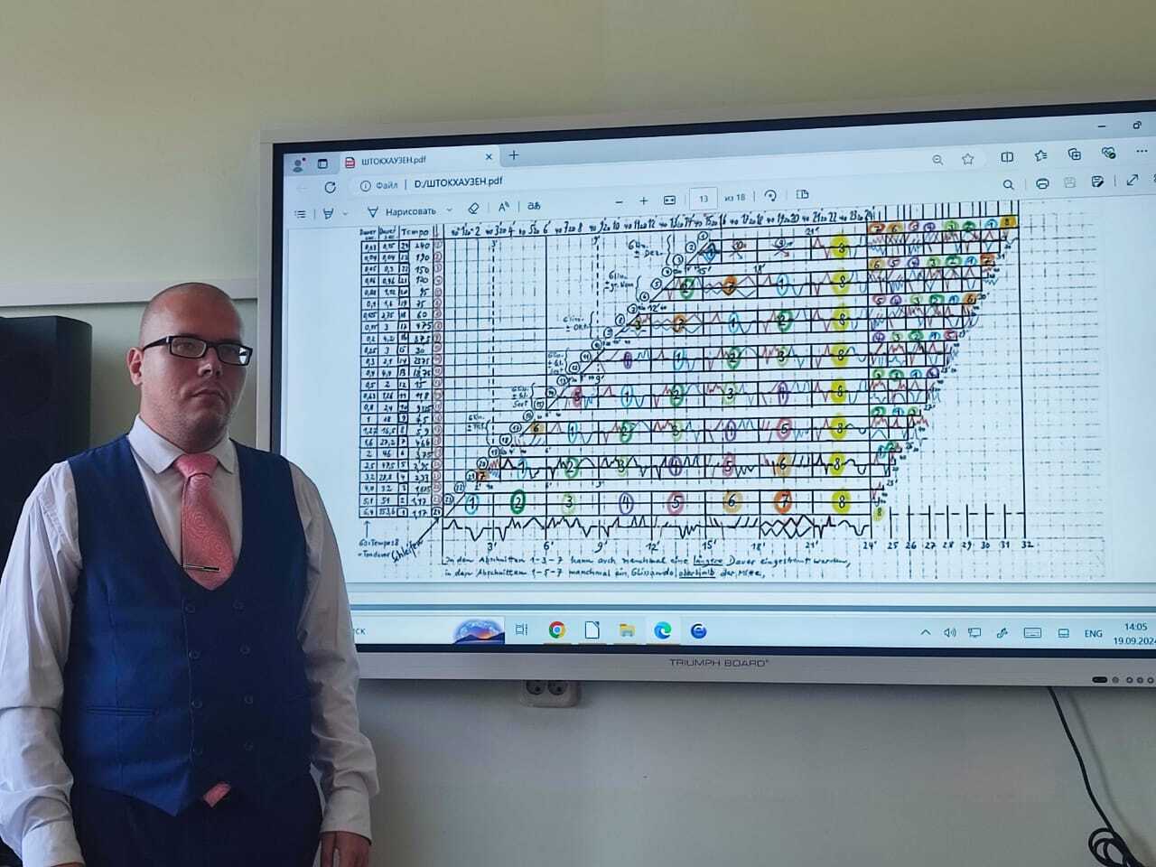 На фото автор выступает с докладом по творчеству Карлхайнца Штокхаузена.