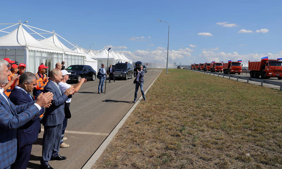 2020 год. В Крыму запустили движение по автомобильной трассе «Таврида». На фото: президент России Владимир Путин (третий слева) и министр транспорта России Евгений Дитрих (слева) во время торжественной церемонии, 2020 год