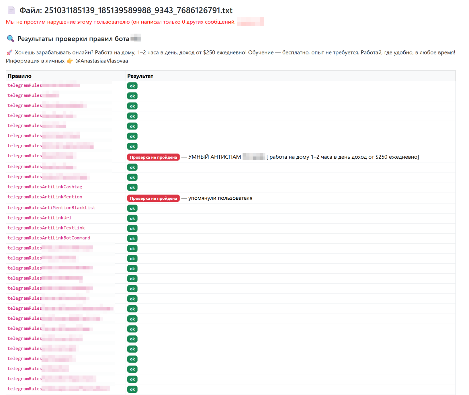Возможность проверить каждое сообщение, чтобы отладить то или иное правило
