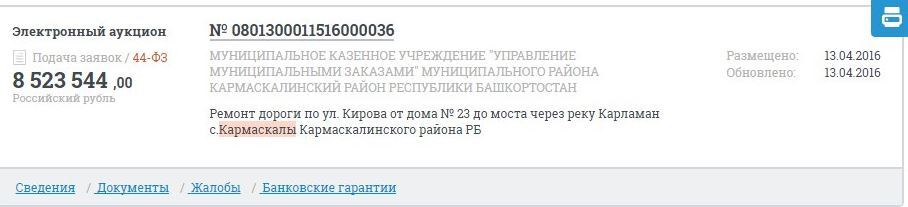 Случайно наткнулся на гос закупки, и был удивлен тому, есть заявка на ремонт дороги, в Кармаскалах, а конкретнее по улице Кирова мост через реку Карламан. Вроде все хорошо,но в Кармаскалах нет моста на Кирова через реку Карламан, она вообще в другой стороне протекает))) я думал ошибка но во всех документах стоит Мост через Каламан.Ошибка?не думаю. закуп был удален после моего обращения в прокуратуру.