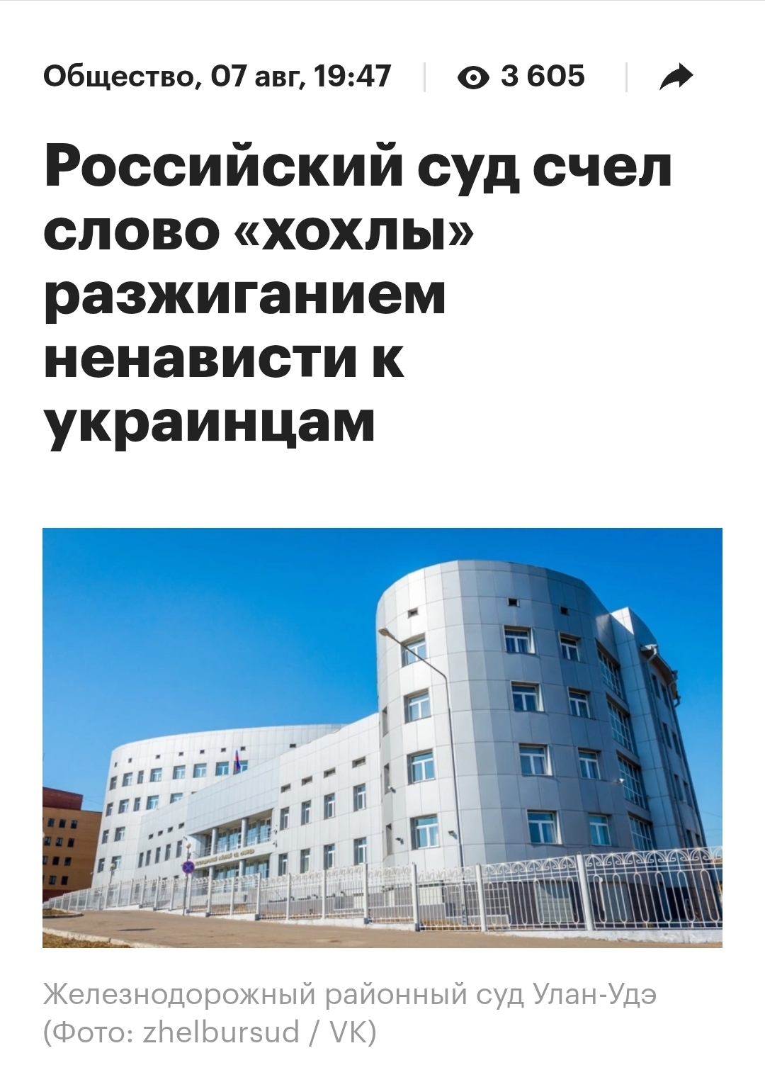 Железнодорожный районный суд Улан-Удэ оштрафовал на 10 тыс. руб. по обвинению в возбуждении ненависти по национальному признаку местную жительницу Евгению Занданову, которая писала в группе в мессенджере комментарии, используя слово «хохлы». Материалы дела опубликованы на сайте суда.