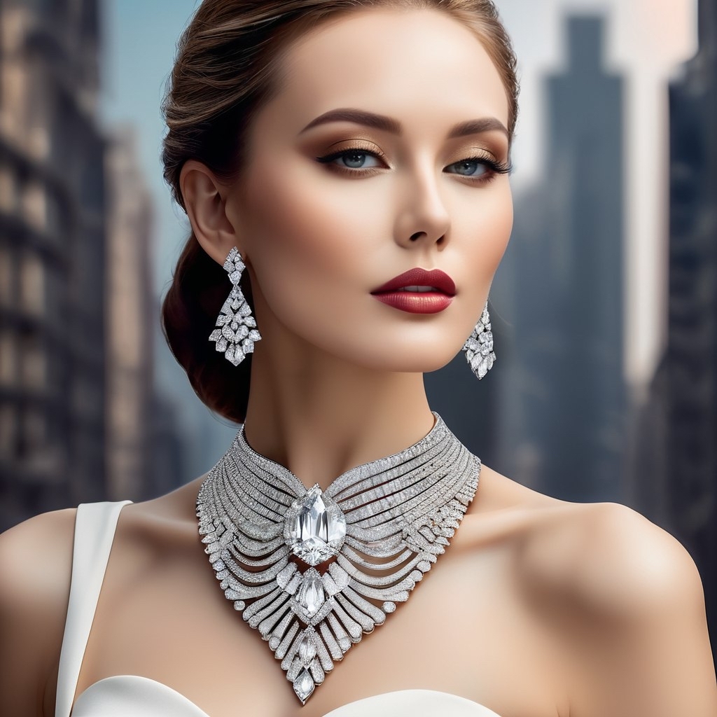 Изысканное ожерелье из блестящих алмазов украшает шею изящной женщины. Орнаменты в виде графических линий и абстрактных фигур создают впечатление воздушности и легкости. Реалистичное фото, созданное в стиле модного журнала, передает элегантность и роскошь этого украшения.