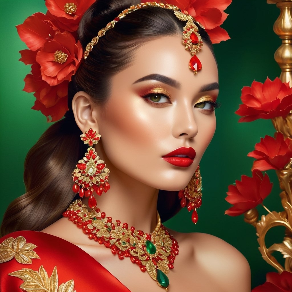 UHD, фотореализм, роскошь, женская красота, цветы, золото, драгоценные камни