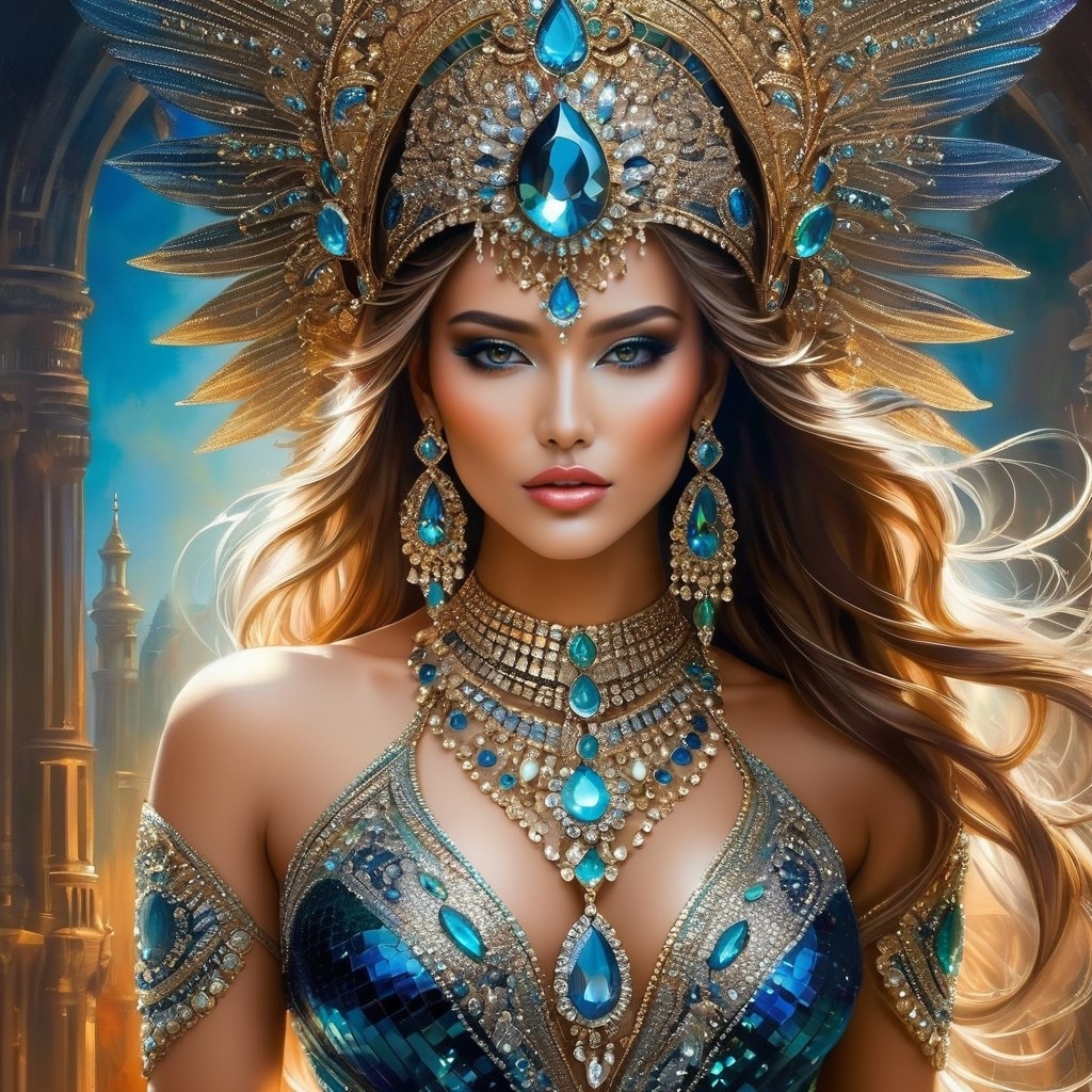 На картине изображена таинственная женщина в полном платье, украшенном переливающимися кристаллами различных оттенков. Ее взгляд наполнен загадкой и силой, а ювелирные украшения на ней словно олицетворяют магическую энергию и притягательность. Образ лица полон деталей и прекрасно передает выразительность и грацию. Вся композиция выполнена с искусством и притягивает взгляд своей неповторимой красотой и роскошью