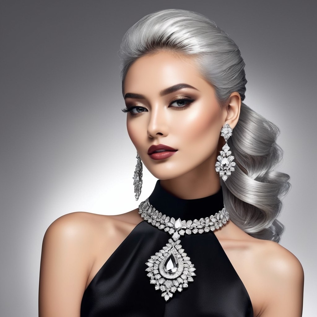 a black dress with a necklace and earrings, elegant gleaming jewelry, platinum jewellery, silver hair ponytail, silver jewelry, glamorous hairstyle, sparkling dark jewelry, glamor hairstyle, silver jewellery, wearing elegant jewellery, girl silver ponytail hair, hints of silver jewelry, jewelry photography, refractive crystal jewelry, luxurious neckless, jewelry, silver necklace, detailed jewellery, wallpaper, raw, uhd, udr, 1024K