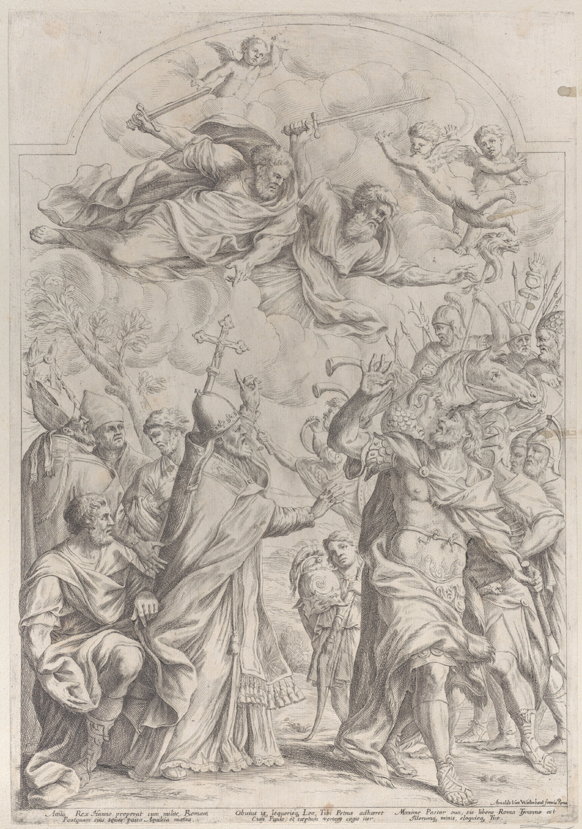 Аттила - вождь гуннов и св.Павел. Иллюстрация к истории Аттилы. конец XVII - начало XVIII. Arnold van Westerhout, гравер. Италия, г. Рим.