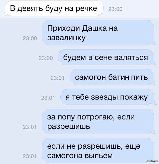 Что-то вспомнилось вот это: "Ровно в полночь. Приходите к амбару. Мне ухаживать некогда. Вы привлекательны, я чертовски привлекателен — чего же тут время терять? В полночь. У амбара. Жду. Не пожалеете."