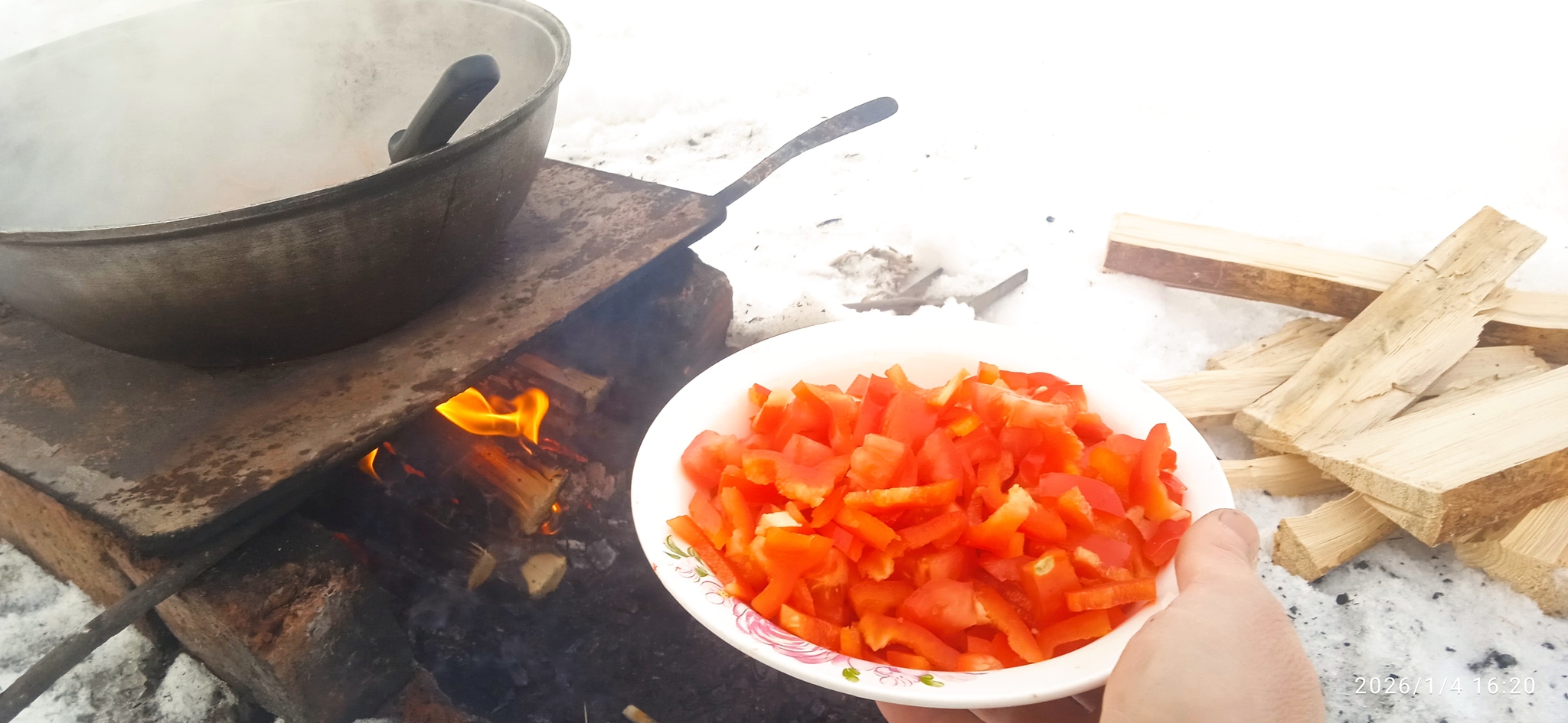 Мангал за лето не успел сделать, поэтому мастерим костер из того что есть, ставим на него казан и наливаем растительное масло.
