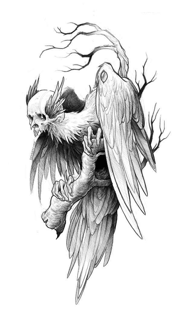 Низом стал стелиться туман, деревья вокруг тропинки пошли сплошь корявые, с узлами и наростами на стволах. Воздух стал заметно теплее и гуще. И двигаться стало труднее. Вдали показалось высокое дерево, на котором сидела стая птиц. Они облепили ветви дерева, шумели, вскрикивали и хлопали крыльями. Немного не дойдя до птичьего насеста, Косик внимательно всмотрелся и чуть не придавил мохнатого, резко отпрянув назад. Вместо голов у птичек были человеческие черепа. В пустых глазницах светились красные огоньки, челюсти с длинными клыками скалились и щелкали. Тощие голые шеи с морщинистыми зобами укутывали черные пушистые боа из перьев. И вся эта стая их заметила.