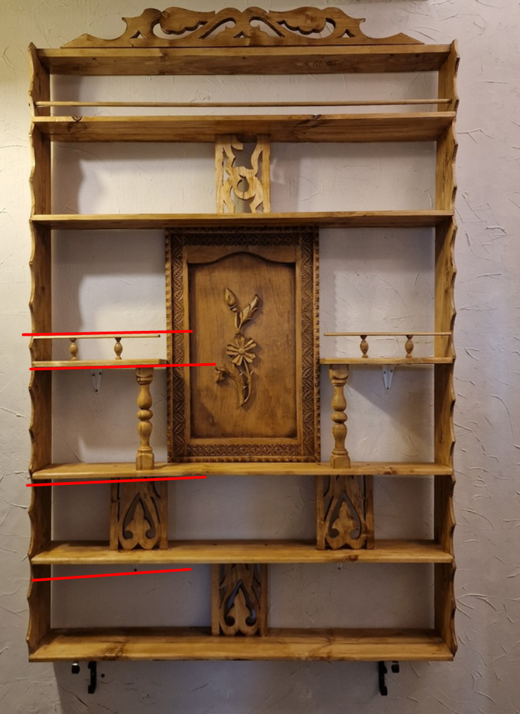 Поскольку вес у хрусталя приличный, креплю к стене как на навесы, размещенные на бывшей дверце (там самое толстое дерево), так и на кронштейны. Ну плюс лохматые черти считают любую полку в доме своей личной лежанкой и прыгают на них с разбега. В общем, теперь и я могу спать на этой полке))