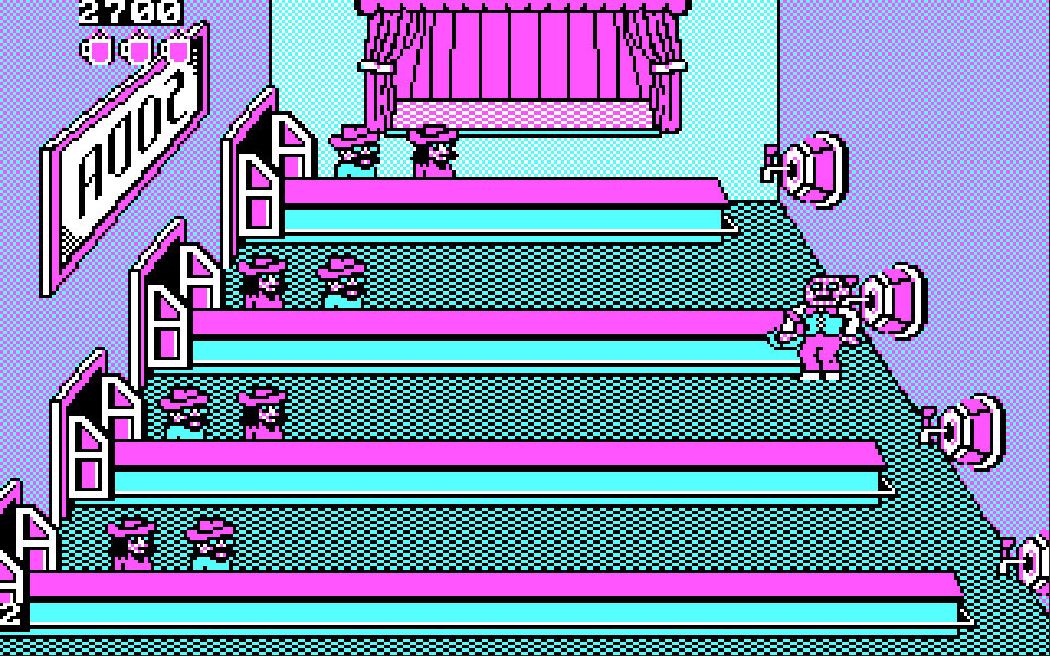 Бармен поит посетителей салуна, наполняя кружку и отправляя её по стойке к клиенту. Клиента при этом отталкивает назад. Цель — выгнать всех посетителей — тогда начнётся следующий уровень. Игра мне запомнилась только тем, что я в неё играл на черно-белом роботроне, где было всего две игры — включая эту. Из забавного - были версии этой игры с безалкогольными напитками, чтобы дети могли играть. На картинке как раз безалкогольная версия - вон SODA написано вместо BEER.