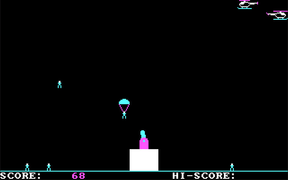 Похоже на то, что это самая старая игра из тех, в которые играл. Ну и одна из первых, само собой. Игровой процесс простейший — по центру экрана зенитка, сверху летают вертолёты, выбрасывающие парашютистов. Если с какой-то стороны на земле наберётся 4 десантника — они строят пирамиду и взрывают зенитку. Чтобы этого не допустить, надо сбивать вертолёты и парашюты. После того, как собьёшь несколько вертолётов, прилетают бомбардировщики и пытаются кинуть бомбу. Её надо сбить, иначе моментальная смерть. У меня никогда особо не получалось, хотя до бомбардировщиков доходил, но бомбы сбивать уже не мог.