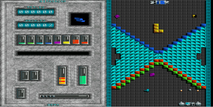 Российская игра на двух игроков, помесь тетриса и арканоида. Верхний игрок играет в тетрис, нижний в арканоид. Насколько помню, побеждал тот, кто больше кирпичей уничтожил.