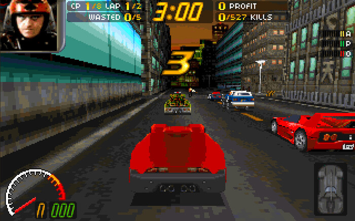 Автомобильные негонки. Оружия нет, кроме разве что шокера у Стеллы, но на машины соперников он не действует. Потому соперников и пешеходов надо давить. Не, если вдруг сильно хочется, то можно проехать несколько кругов и финишировать. Но это не так интересно.